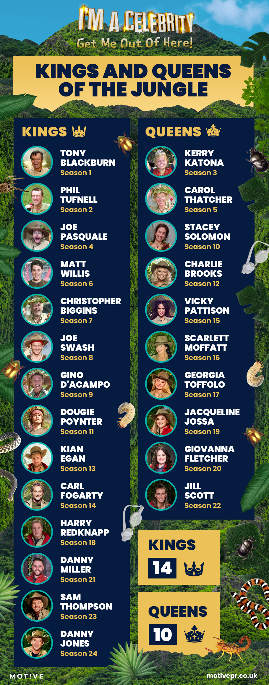 As we head into the latest series, another pattern emerges from across the show's 23-year history. A three-way battle between musicians, reality stars, and actors, each of whom have claimed the crown five times. With 14 kings and 10 queens so far, the jungle is open once again. Will an old favourite profession reclaim its lead, or will a new type of celebrity rise to the top of the Australian jungle?