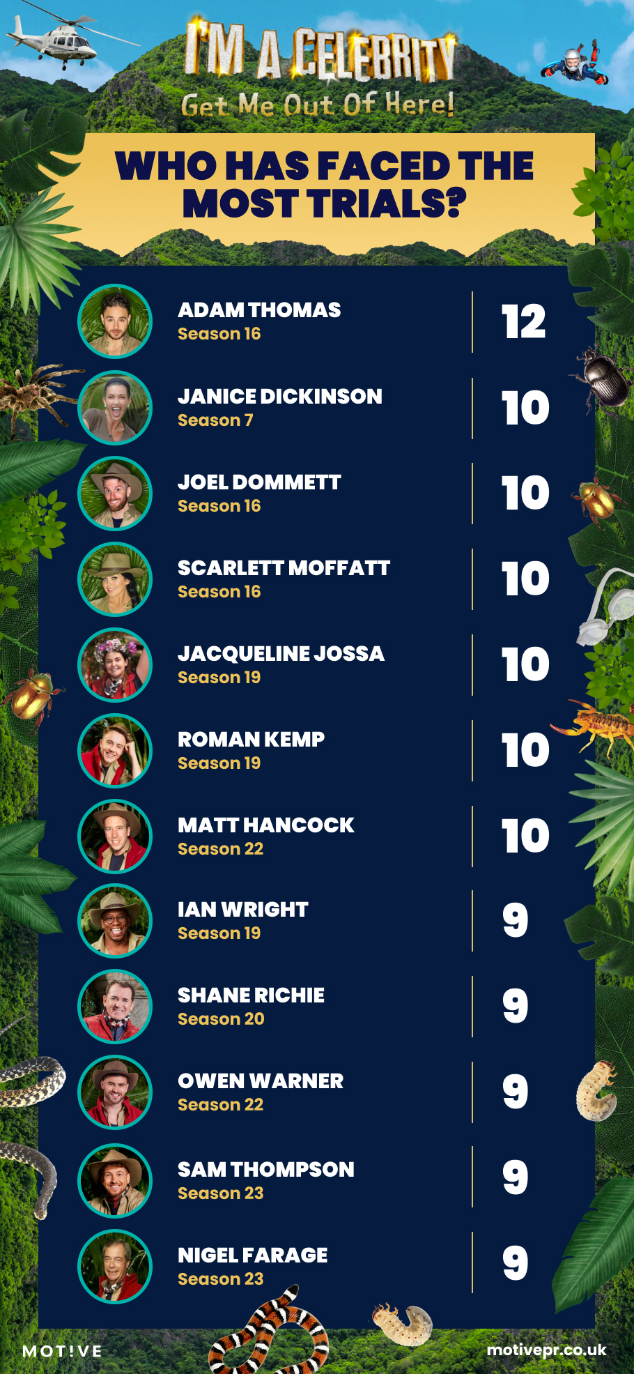 It probably comes as no surprise that Adam Thomas makes the list, winning 53 stars from his record-breaking 12 trials, while Shane Richie features too, with 57 stars from his 9 trials. Naughty Boy from series 21 also makes the top 10, proving himself to be a good boy by winning 52 stars for camp from his eight Bushtucker Trials.